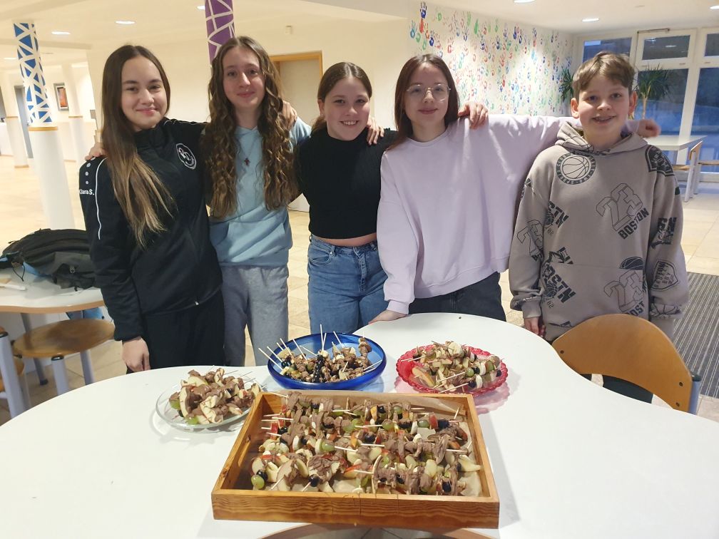 Am vergangenen Montag engagierte sich das Fair-Trade-Team unserer Realschule unter Leitung von Frau Spielberger und Frau Nüsslein mit einem besonderen Projekt für eine bewusste und nachhaltige Ernährung. Luca (7a) sowie Leonie, Michelle, Magdalena und Klara (alle 7b) trafen sich bereits um 7 Uhr morgens, um frisches Obst vorzubereiten und es ganz frisch anzubieten. Anschließend wurde das Ganze noch mit fair gehandelter Schokolade überzogen: Es gab also faire Schokospieße, die reißenden Absatz fanden.