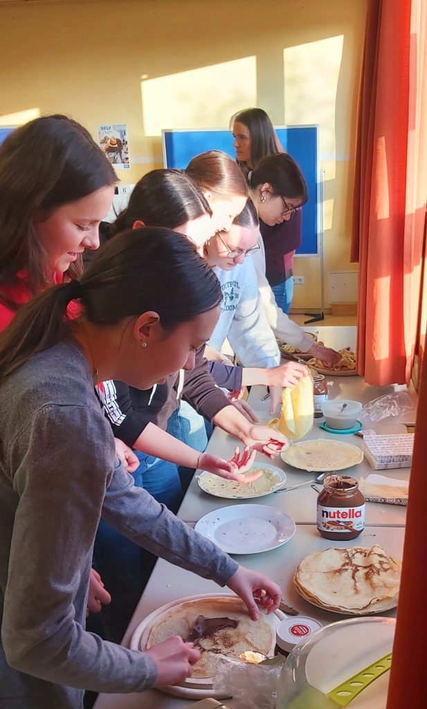 Ein Highlight war der Crêpes-Verkauf, organisiert von Frau Wangler. In der Pause konnten sich Schüler und Lehrer über frisch zubereitete Crêpes freuen und dabei die französische Esskultur genießen.