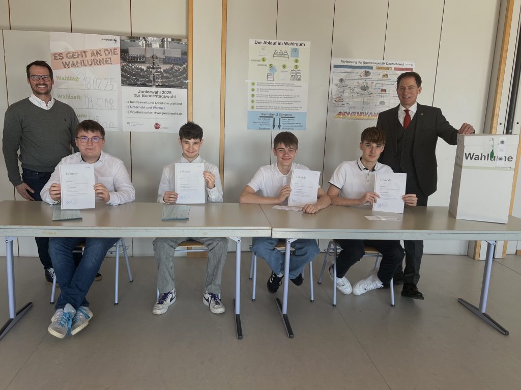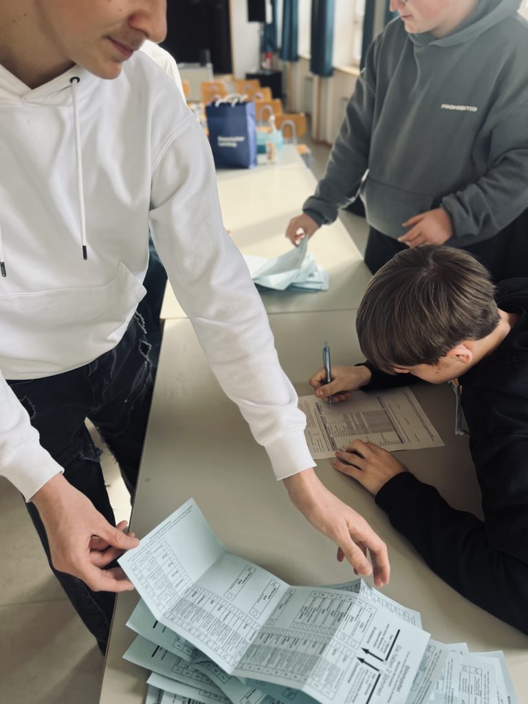 Bei der Juniorwahl zur Bundestagswahl konnten unsere Schüler politische Teilhabe praktisch erleben. In der zum Wahllokal umfunktionierten Aula organisierten sie die Wahl eigenständig – von der Ausgabe der Wahlunterlagen über die Abstimmung bis hin zur Stimmenauszählung.